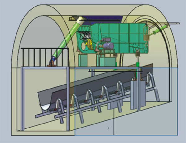 皮带输送运行,槽体具有一定的倾角,端部挡料系统打开,开动振动电机,物料向槽体出料口运动,实现给煤。需要频繁调整给煤量时,油缸驱动槽体回转系统停止工作,此时槽体角度固定,给煤量固定;需要改变煤量时,调整前部调角弹簧的高度,改变槽体倾角,从而改变给煤量。当锁口位置煤料起拱时,开动锁口位置斜支破拱系统,破除起拱;当料仓锥段位置出现起拱时,开动锥段破拱系统,破除起拱,当需要停止输送煤时,关闭振动电机,端部挡料系统关闭,输煤停止,皮带输送停止运行。